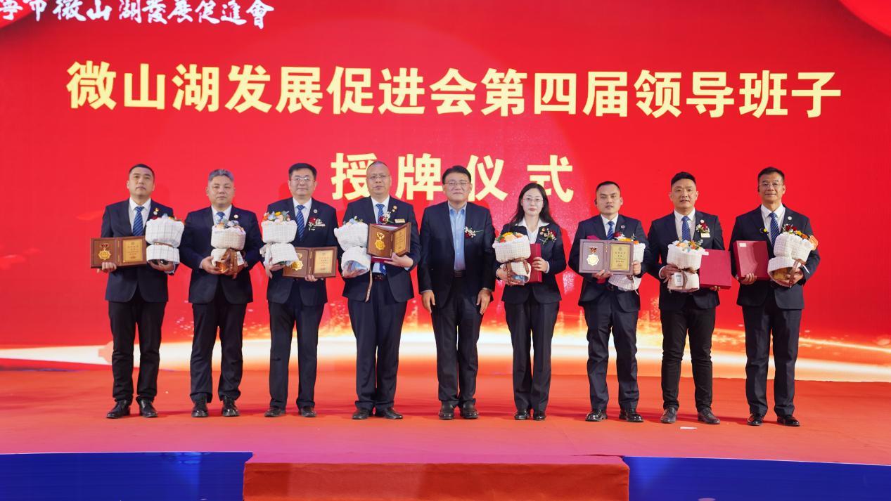李敬为济宁市微山湖发展促进会第四届核心班子成员颁发了牌匾。