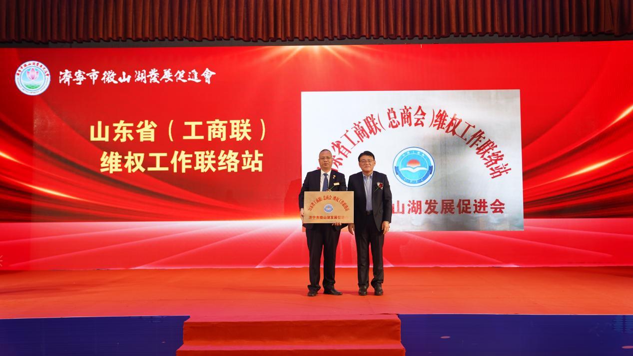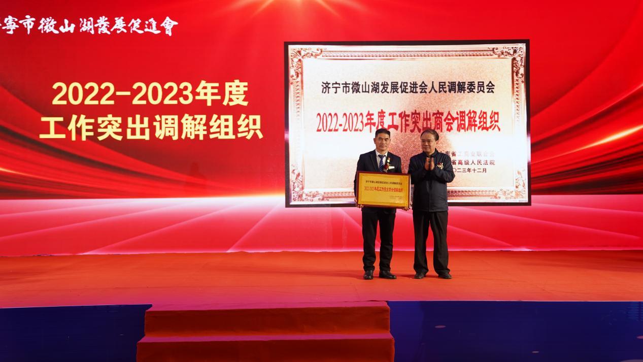 李良品、李敬为促进会颁发了2022-2023年度工作突出调解组织牌匾、山东省(工商联)维权工作联络站牌匾。