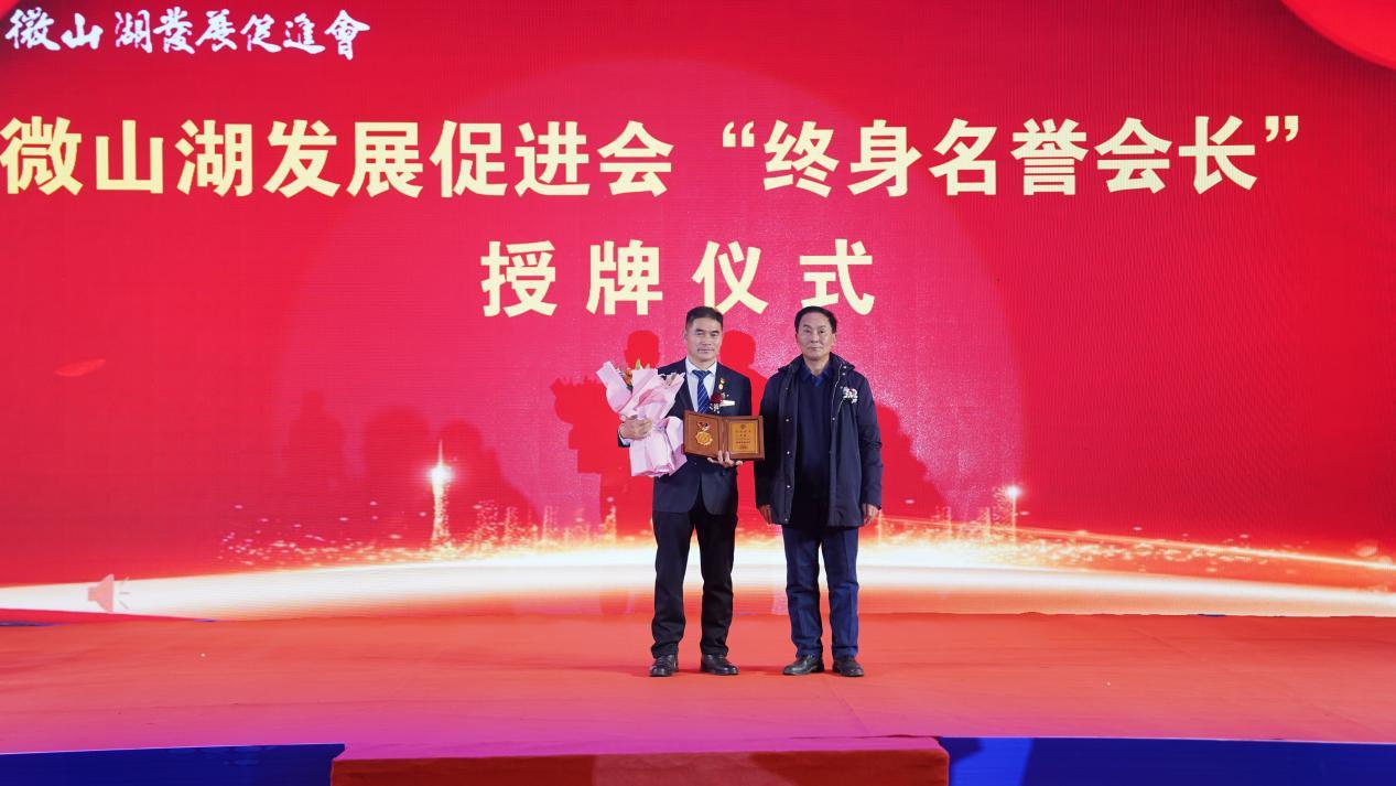 济宁市委常委、济宁军分区政委王洪奇为焦健颁发了济宁市微山湖发展促进会“终身名誉会长”牌匾。