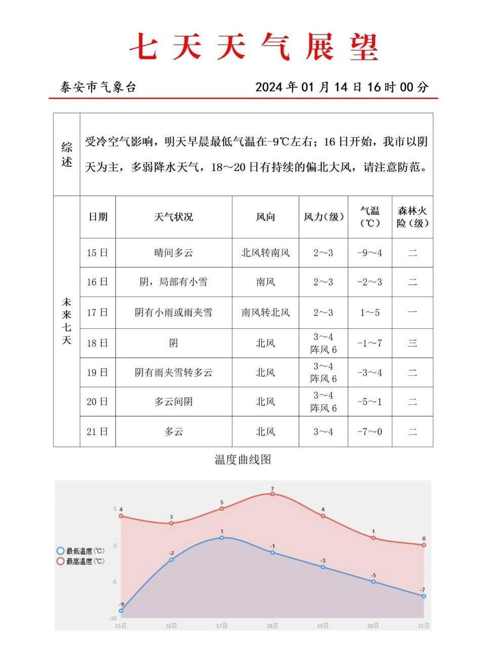 泰安市气象局1月14日16时发布天气预报:受冷空气影响,明天早晨最低气温在-9℃左右;16日开始,泰安市以阴天为主,多弱降水天气,18~20日有持续的偏北大风,请注意防范。受此影响,泰山或将出现-20℃的低温雨雪天气,建议游客择期游览泰山,确需游览泰山的务必做好防风防寒防雨雪准备。
