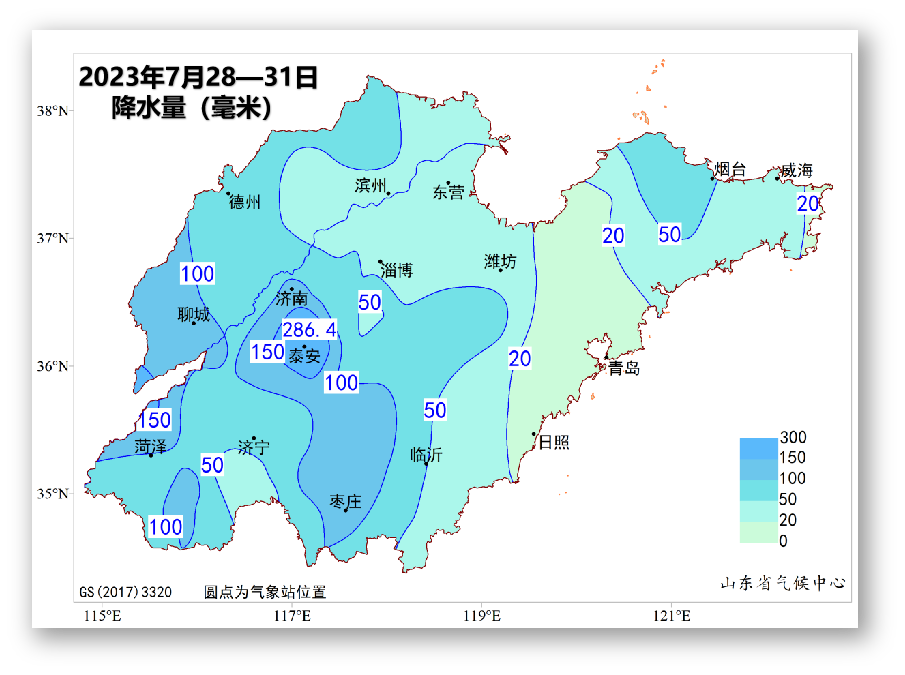 受台风“杜苏芮”影响,7月28—31日山东中西部出现暴雨到大暴雨,局部特大暴雨。全省过程平均降水量60.7毫米,滕州、鄄城等22县(市、区)累积降水量超过100毫米,泰山最大286.4毫米。30日泰山降水量196.4毫米,突破当地历史极值。