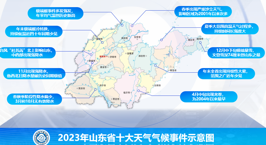 2023年,全球、全国平均气温均创下有气象观测记录以来的历史新高,山东平均气温15.0℃,较常年偏高1.2℃,为1951年有气象记录以来最高。其中,1—11月各月平均气温均偏高,3月、10月异常偏高3.7℃、2.4℃。全年发生3次持续极端暖事件,为1951年有气象记录以来历史同期最高或次高,其中,10月31日—11月2日潍坊、淄博等地的20县(市、区)超过30℃,除成山头、长岛外,其他各地最高气温均达到或突破当地11月历史极值。