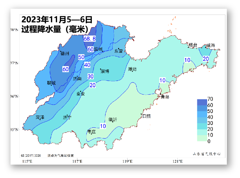 2023年11月5—6日,全省出现大范围强降雨天气,平均降水量27.0毫米,最大过程降水量68.8毫米(庆云),临清、长清等16县(市、区)日降水量突破当地11月历史极值。本次全省范围降水有效改善了土壤墒情。
