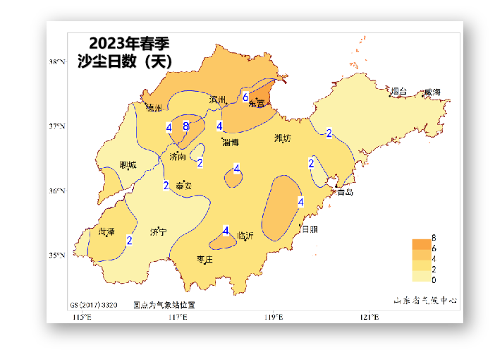 2023年春季,山东出现4次大范围沙尘天气,影响区域为2001年以来第二多,仅次于2021年;利津、河口等8县(市、区)沙尘日数达6天以上。其中,3月22—23日,滕州、台儿庄等37县(市、区)出现沙尘天气,利津出现能见度不足1000米的沙尘暴;4月10—12日,青州、寿光等89县(市、区)出现沙尘天气,影响范围广。