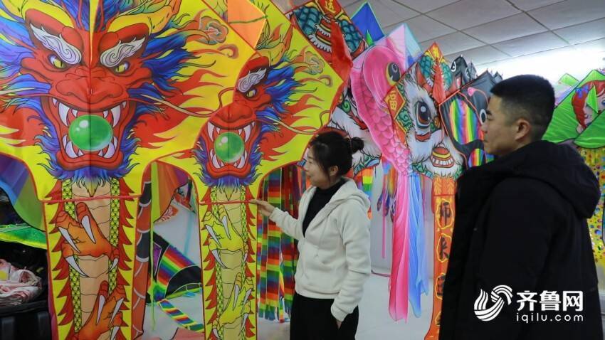 在坊子区大山风筝厂,企业负责人孙月梅正在向客户展示今年新设计的“龙元素”风筝。龙是中华民族的图腾,这款“龙元素”风筝一上市,就迅速成为了热销品,单品订单量占到企业总订单量的50%以上。