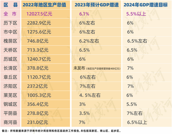 在政府工作报告中,12个区县公布了2024年GDP增速目标,全部处在5.5%到7%的区间。其中,包括历下区、市中区、历城区、章丘区、莱芜区几个GDP破千亿的区县都将GDP增速目标数值设定为6%,长清区、济阳区、平阴县设定的GDP增速目标最高,为7%左右,此外,槐荫区、天桥区、商河县的GDP增速目标数值设定为6.5%左右,钢城区设定的GDP增速目标最低,为5.5%,但与其2023年的预计GDP增速3%相比,目标提高了2.5个百分点,在12个区县中,若以目标增长数排名来看,能排进前三位。