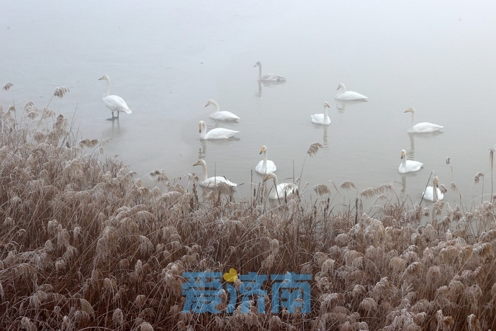 在被誉为济南“天鹅湖”的鹊山水库沉砂池湿地,成群的天鹅在大雾中时隐时现,结伴越冬。天鹅们水中游弋、冰上漫步、追逐嬉戏、振翅起舞,引颈长鸣呼朋引伴,十分优雅。