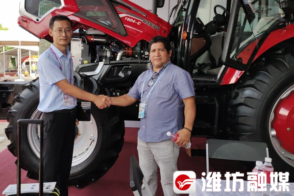 2023年11月,在第134届广交会上,山东悍沃农业装备有限公司工作人员(左)与客户合影。(资料图)