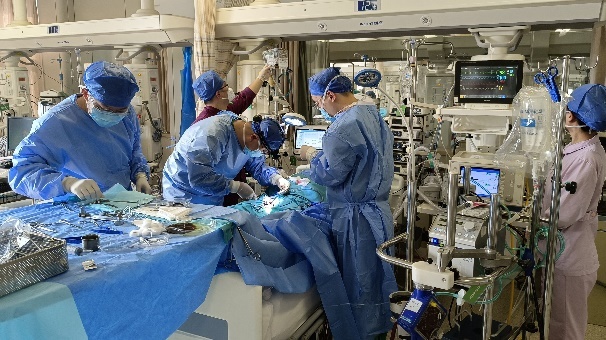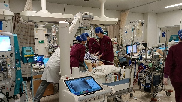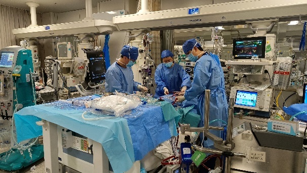 患者产后病情继续恶化,心率增快,氧合、血压下降,紧急转入重症医学科,无创呼吸机支持无效后,给予气管插管有创通气治疗。床旁X线拍片提示肺部炎症、透光度明显减低,心影扩大、心胸比例68%。患者昏迷状态,体温38.8℃,重度休克、心肺肾多脏器衰竭,乳酸持续上升,WBC:18.9X10^9/L,全身炎症反应剧烈,PCT:7.8ng/ml,IL-6等指标飙升,床旁超声检查左心室射血分数仅有20%,心率130次/分,去甲肾、多巴胺最大量联合用药,血压仍61/43mmHg,难以维持,气道内不断涌出大量血性泡沫痰,呼吸频率35次/分,气道峰压高,呼吸机送气困难,100%纯氧吸入,血氧饱和度仅能维持在80%,病情危急随时有心脏骤停风险。APACHE II评分41分,SOFA评分15分,预期死亡率96.3%。重症医学科副主任郭海鹏、李琛商议后,决定立即给予VAV-ECMO三插管技术心肺联合支持,同时进行NO吸入扩张肺动脉、CRRT积极容量管理及血液灌流清除炎症。ECMO夜间上机操作由李毅辉副主任医师,张学海、毛洋主治医师,王成涛主管护师实施。