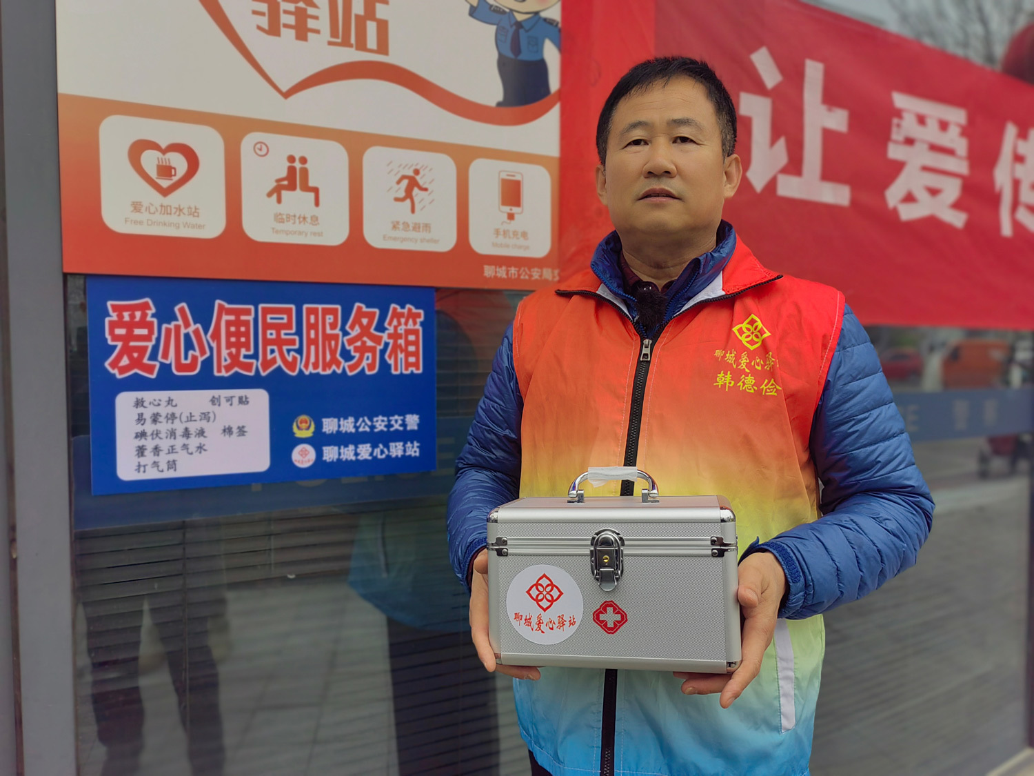 3月4日中午12点半,志愿者姚立春将“爱心便民服务箱”的标识牌贴到柳园路和建设路路口聊城市公安局交巡警支队交通管理服务站的醒目位置,随后,聊城市东昌府区爱心驿站理事长韩德俭将一个“小药箱”和一套打气筒亲手交到执勤民警手中,叮嘱道:“箱子里有创可贴、速效救心丸、藿香正气水等,可随时为需要的市民提供便利。”
