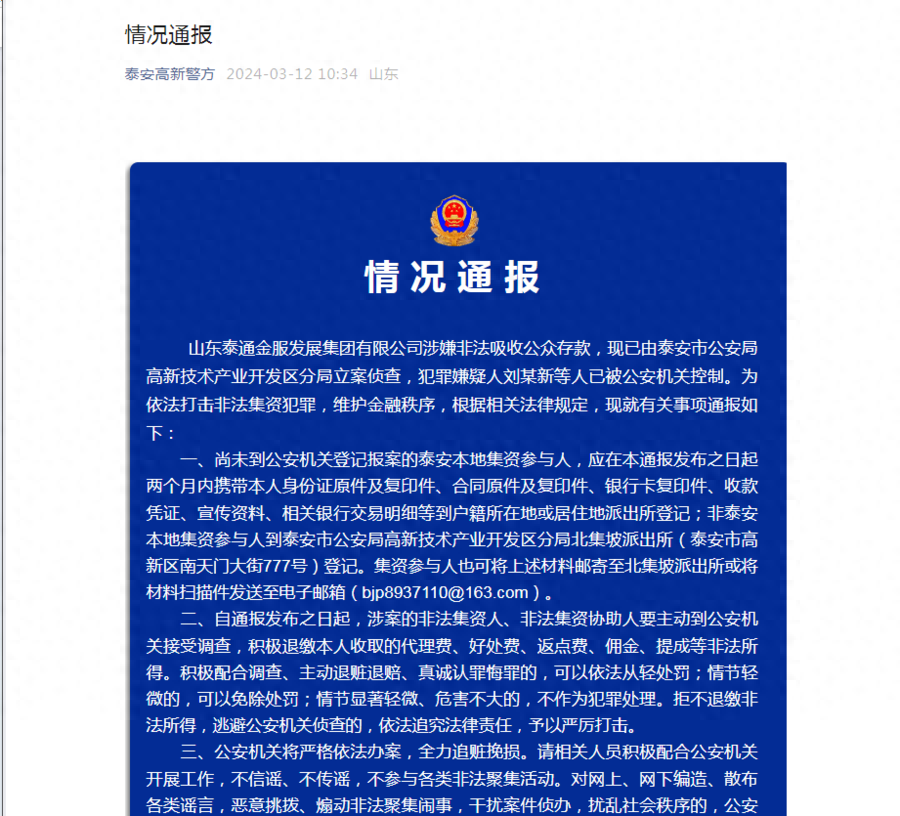 山东泰通金服发展集团有限公司涉嫌非法吸收公众存款,现已由泰安市公安局高新技术产业开发区分局立案侦查,犯罪嫌疑人刘某新等人已被公安机关控制。为依法打击非法集资犯罪,维护金融秩序,根据相关法律规定,现就有关事项通报如下: