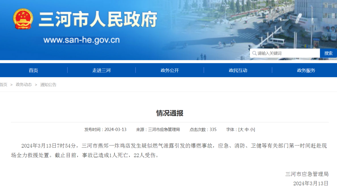 据三河市政府网站消息,三河市应急管理局发布情况通报:3月13日7时54分,三河市燕郊一炸鸡店发生疑似燃气泄漏引发的爆燃事故,应急、消防、卫健等有关部门第一时间赶赴现场全力救援处置。截至目前,事故已造成1人死亡、22人受伤。