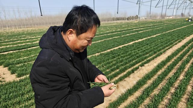 山东德州夏津县种粮大户张庆海在查看苗情。新华社记者萧海川 摄 “局里26名农技推广专家分片帮包13个乡镇街道,已组织100余人次到基层进行技术指导、及时掌握春季苗情动态。”德州市陵城区农业农村局副局长贾胜军说,当地冬小麦一二类苗面积超过90万亩,平均单株分蘖数等影响产量的关键数据较去年均有明显提升。