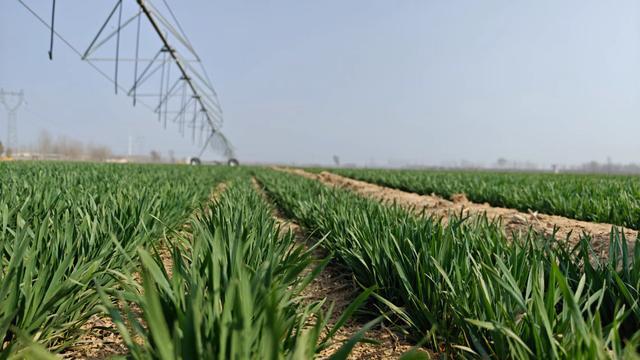 山东德州夏津县东李官屯镇的一处麦地。新华社记者萧海川 摄 站在绿油油的麦地里远眺,黄河冲积形成的土地一马平川,点缀在田间的自走式喷灌机、无人值守植保站和小型气象站清晰可见。已有脚面高的麦苗迎着阳光随风摇曳,望不到边的麦青色里,透着一股子向上生长的劲头。
