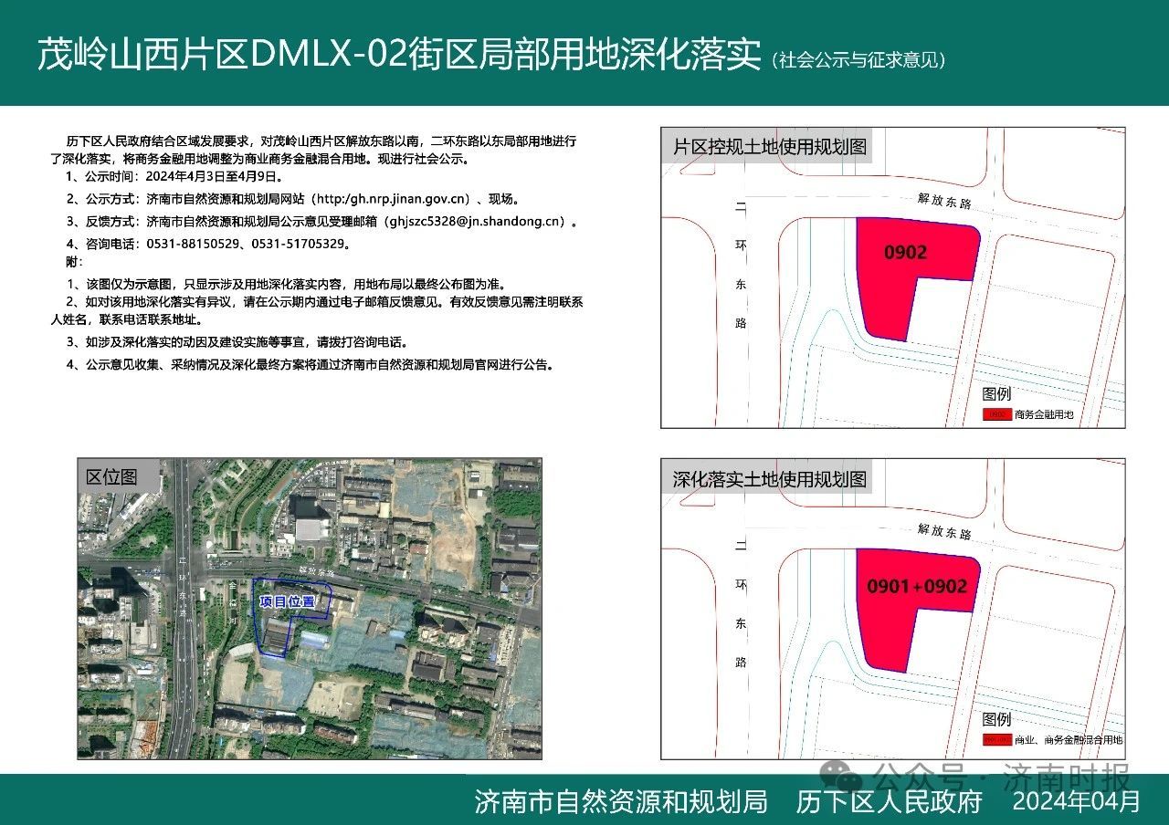 据公示内容,历下区人民政府结合区域发展要求,对茂岭山西片区解放东路以南,二环东路以东局部用地进行了深化落实,将商务金融用地调整为商业商务金融混合用地。现进行社会公示。