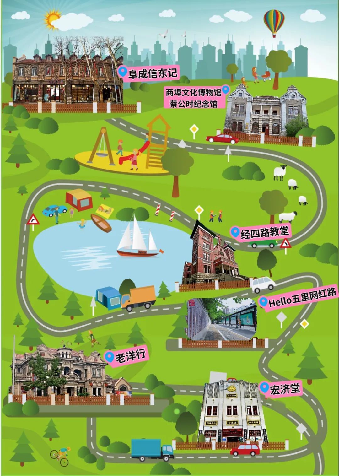济南商埠文化博物馆→蔡公时纪念馆→经四路基督教堂→Hello五里沟网红路→老洋行→一大食品店→经三路精致小店→宏济堂中医药博物馆→阜成信东记→经二路精致小店→经二路逛吃新高地→经一纬九“串儿街”