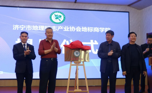 原市委常委、统战部部长张开朗、原济宁市环保局局长谷传祥、原济宁市科协主席王强、济宁市地理标志产业协会党支部书记焦健共同为济宁市地理标志产业协会“地标商学院”揭牌。
