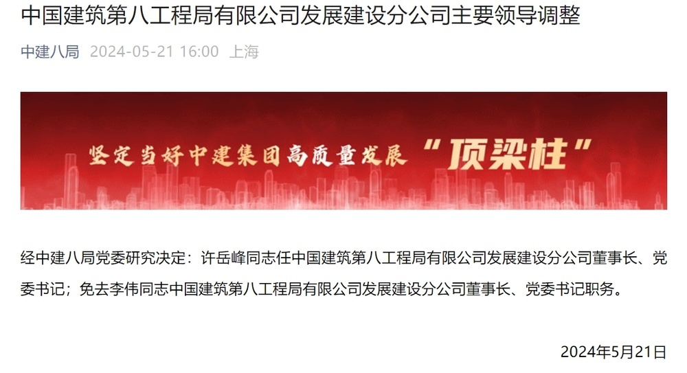经中建八局党委研究决定:许岳峰同志任中国建筑第八工程局有限公司发展建设分公司董事长、党委书记;免去李伟同志中国建筑第八工程局有限公司发展建设分公司董事长、党委书记职务。