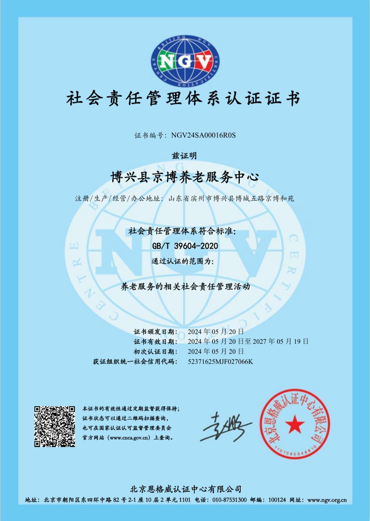 作为五星级养老机构,京博养老中心始终牢记对社会的使命和责任,不断提高自身水平,积极参与并推动养老体系认证工作,严格贯彻高标准的养老服务,赋能养老行业标准化建设,打造引领行业高水平的发展,凝心聚力做中国县域级民办普惠养老的样板!