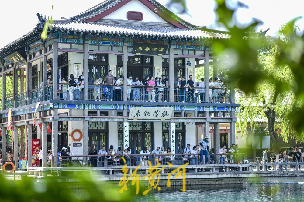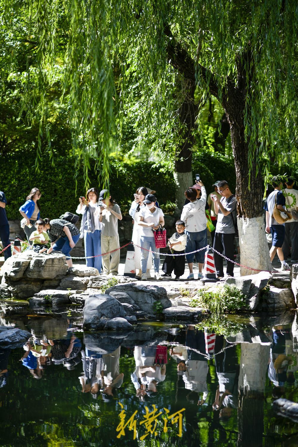5月26日,随着凌晨降雨和大雾的远去,泉城迎来了晴好天气,最高气温只有26.6℃,没有了前几日的炎热感,降雨也让泉水的喷涌更加有力。在五龙潭泉群,泉水喷涌欢畅,泉畔花红柳绿, 蓝天白云和水面相互映衬,显得泉水愈发澄澈碧绿,众多游客观泉亲泉感受夏日清风。