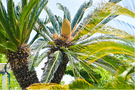 古词云:“千年铁树开花,万年枯藤发芽”。自古以来,铁树开花便是件尤为罕见的奇闻。铁树,本是一种极为坚韧的树种,以其耐旱的特性闻名。在泉香酒庄,六株铁树静静地矗立,与周围的绿树形成了鲜明的对比。铁树高大挺拔,树干粗糙而有力,宛如一位身披铁甲的勇士,守护着这片美丽的土地。