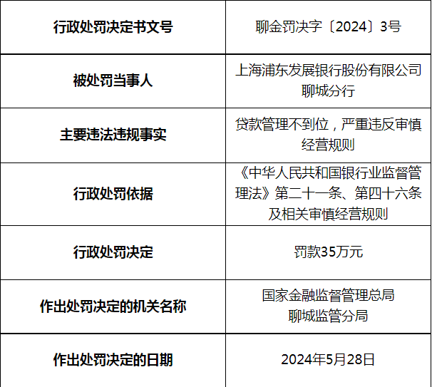 凤凰网山东(报料微博@凤凰网山东)近日从国家金融监督管理总局山东监管局网站获悉,因贷款管理不到位,严重违反审慎经营规则,国家金融监督管理总局聊城监管分局依据《中华人民共和国银行业监督管理法》第二十一条、第四十六条及相关审慎经营规则对上海浦东发展银行股份有限公司聊城分行作出罚款35万元的行政处罚决定。