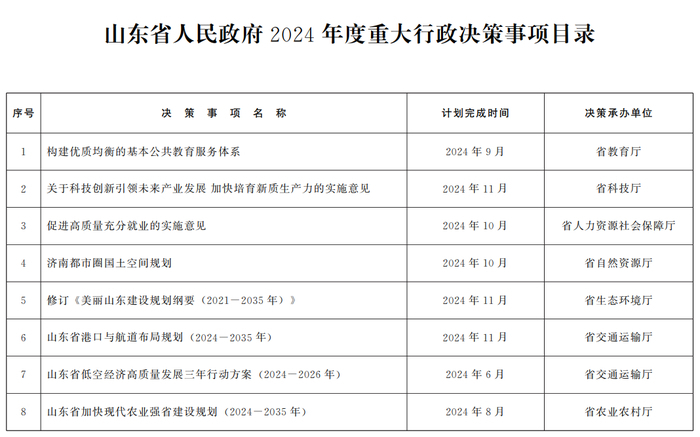 除了《济南都市圈国土空间规划》,2024年度重大行政决策事项另外7件分别是:《构建优质均衡的基本公共教育服务体系》《关于科技创新引领未来产业发展加快培育新质生产力的实施意见》《促进高质量充分就业的实施意见》《修订美丽山东建设规划纲要(2021—2035年)》《山东省港口与航道布局规划(2024—2035年)》《山东省低空经济高质量发展三年行动方案(2024—2026年)》《山东省加快现代农业强省建设规划(2024—2035年)》,涉及教育、就业、科技、生态、农业、交通等重要领域或战略性新兴产业。其中,由山东省交通运输厅承办的《山东省港口与航道布局规划(2024—2035年)》《山东省低空经济高质量发展三年行动方案(2024—2026年)》已向社会公开征求意见。目前,《济南都市圈国土空间规划》列入目录的重大行政决策事项要严格履行法定程序,山东要求各决策承办单位把握时间节点,确保按时高质量完成。目录实行动态管理,确需调整重大行政决策事项的,决策承办单位要按照《山东省重大行政决策事项目录管理办法》规定程序办理。