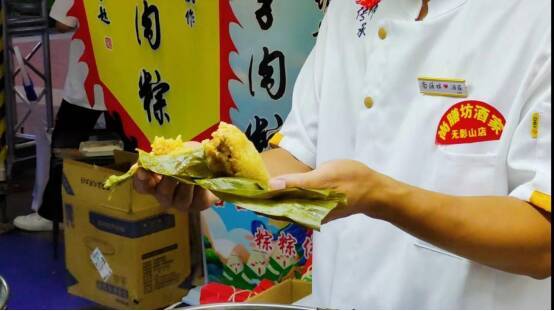 恰逢端午节假期,尚善坊把子肉等多个摊位均推出了把子肉粽产品,粽叶的清香很好的缓解了把子肉的肥腻,受到游客追捧。