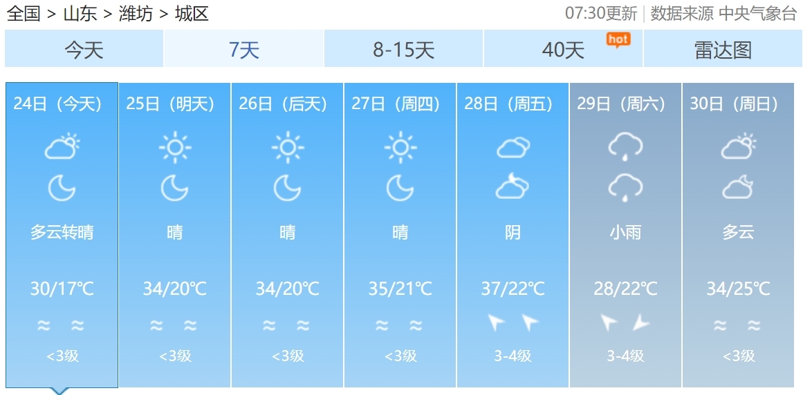 25日白天到夜间,天气晴间多云,南风3~4级,最低气温20℃,最高气温34℃。