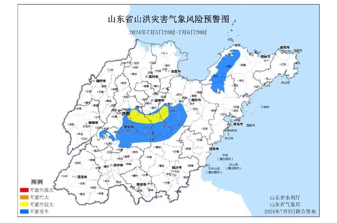 预计7月5日20时至7月6日20时,济南、泰安、淄博、潍坊市局部地区发生山洪灾害的可能性较大(黄色预警),济南、泰安、济宁、临沂、淄博、潍坊、青岛、烟台等市局部地区可能发生山洪灾害(蓝色预警)。