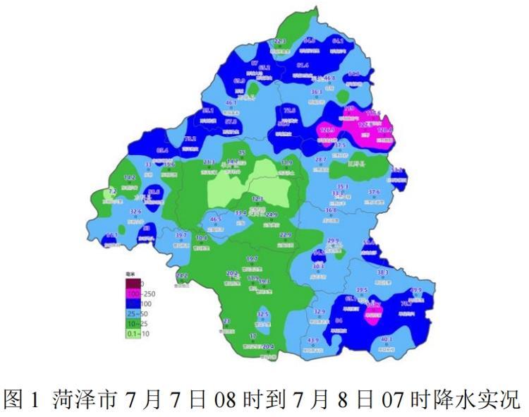 8日00时~8日07时,全市平均降水量(单位:毫米,下同)11.7mm,站点降水量前三位的分别是:单县孙溜105.0mm、单县龙王庙93.1mm、单县李田楼83.2mm;最大小时雨强出现在单县龙王庙(58.1mm)。过去三小时内全市气象站点未监测到风力超过7级的阵风。7月7日08时~8日07时,全市过程平均降水量38.6mm(图 1),站点降水量前三位的分别是:巨野麒麟128.4mm、巨野国家气象观测站127.9mm、郓城南赵楼126.9mm。全市大暴雨(大于100)站点6个,暴雨(50~100mm)站点35个。