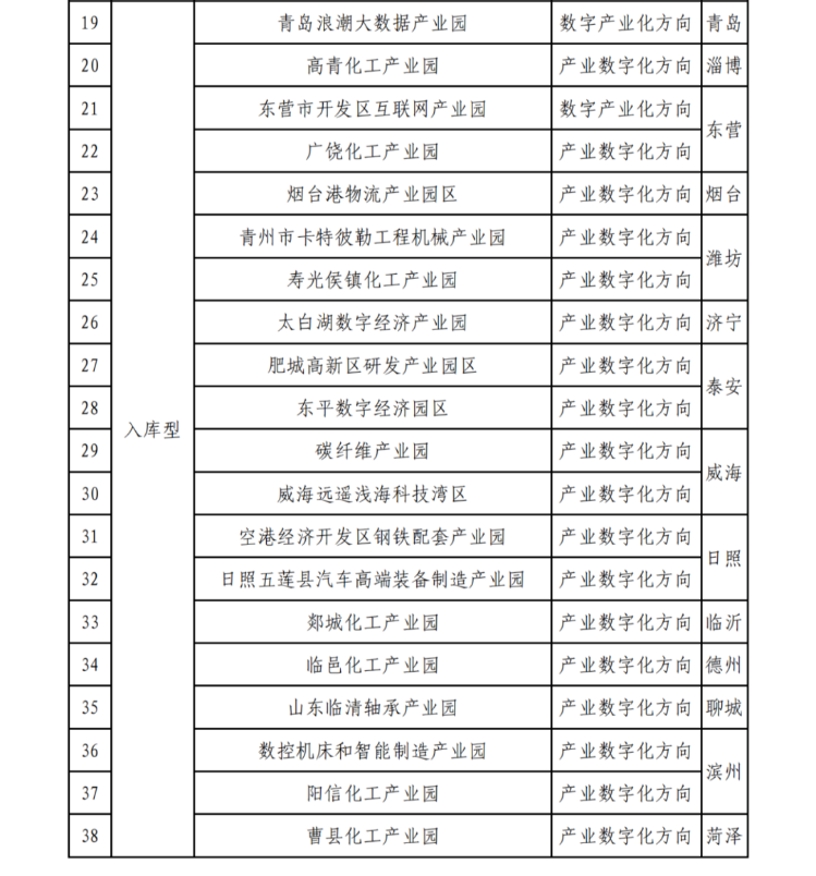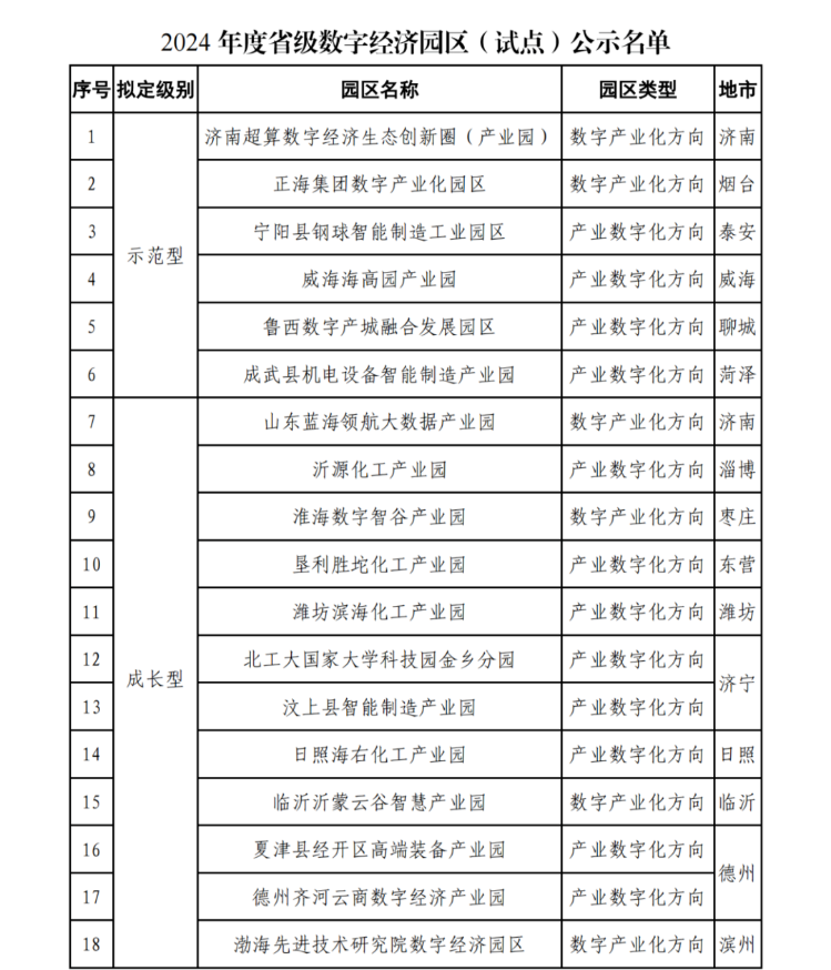 为贯彻落实省委省政府《关于加快数字经济高质量发展的意见》《关于印发2024年“促进经济巩固向好、加快绿色低碳高质量发展”政策清单(第一批)的通知》有关精神,加快推动我省产业转型升级和高质量发展,培育一批产业集聚水平高、辐射带动效应强的数字经济园区,我厅组织开展了2024年度省级数字经济园区(试点)评定工作。经单位申报、市局推荐、专家评审等程序,拟确定济南超算数字经济生态创新圈(产业园)等6个示范型园区、山东蓝海领航大数据产业园等12个成长型园区、青岛浪潮大数据产业园等20个入库型园区。现予公示。