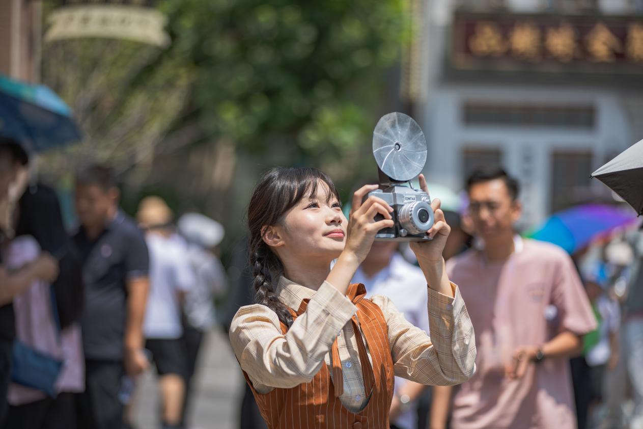 除游乐项目外,济宁方特东方欲晓还精心打造了复古与繁华交织的香港街、精致和惬意并存的上海街两大复古潮拍街区。通过沉浸式的情景演艺,让游客们享受百乐门的歌舞升平和港风disco的热烈节奏,感受历史与现代交融的无限魅力。高度还原的复古建筑、华丽精美的年代美陈,配合高颜值达人的精彩演艺,勾勒出一幅幅展现时代变迁与文化传承的生动画卷,成为体验官们的拍照“打卡胜地”。