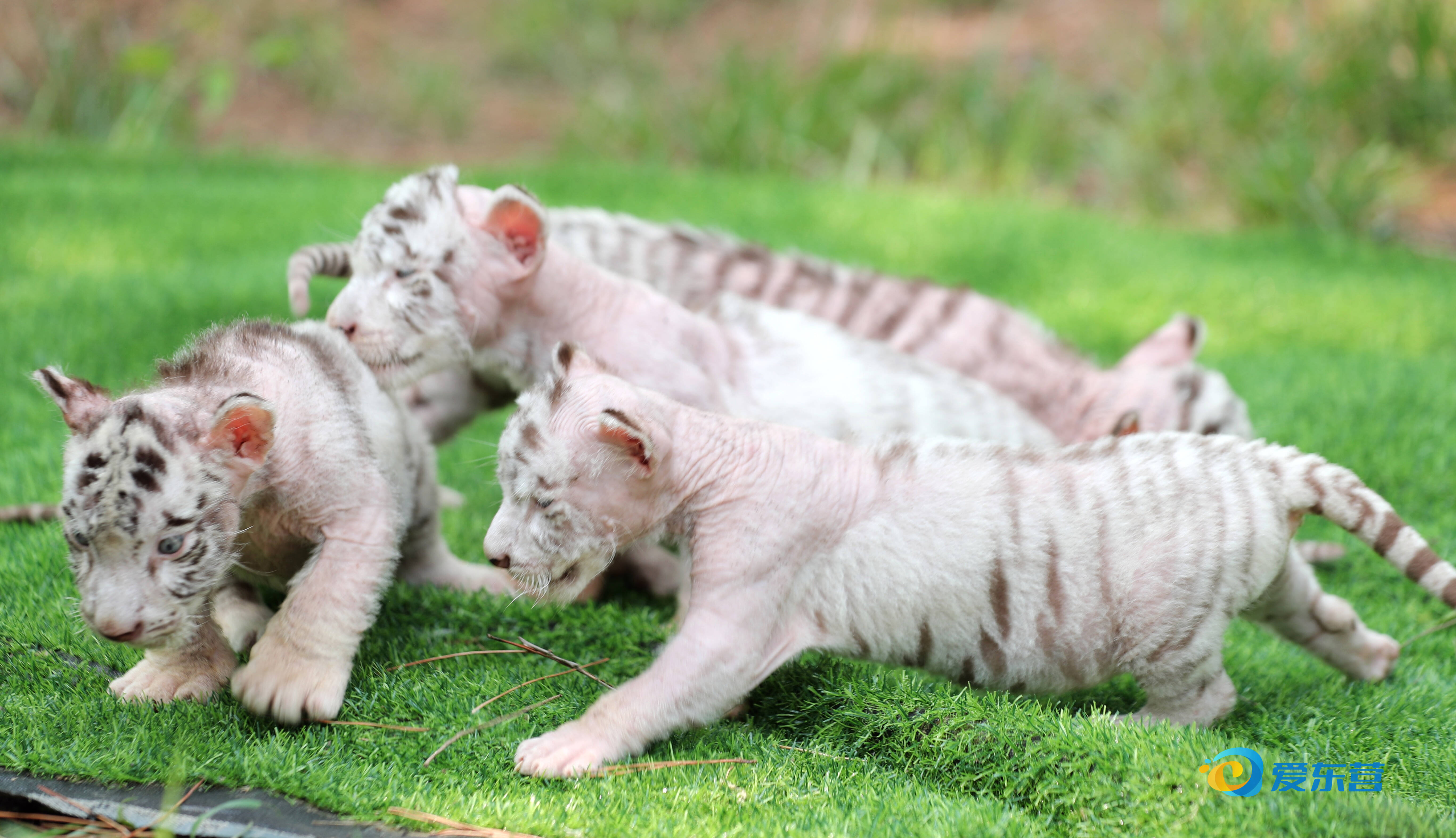 近日,在黄河三角洲动物园,白虎虎崽在草地上嬉闹。据悉,6月5日,该园成功繁育出五只国家一级保护动物白虎,体征平稳,茁壮成长。白虎又称白化孟加拉虎,是孟加拉虎的一个变种,因其稀有的白色毛发和黑色条纹而闻名,数量极为稀少而珍贵。