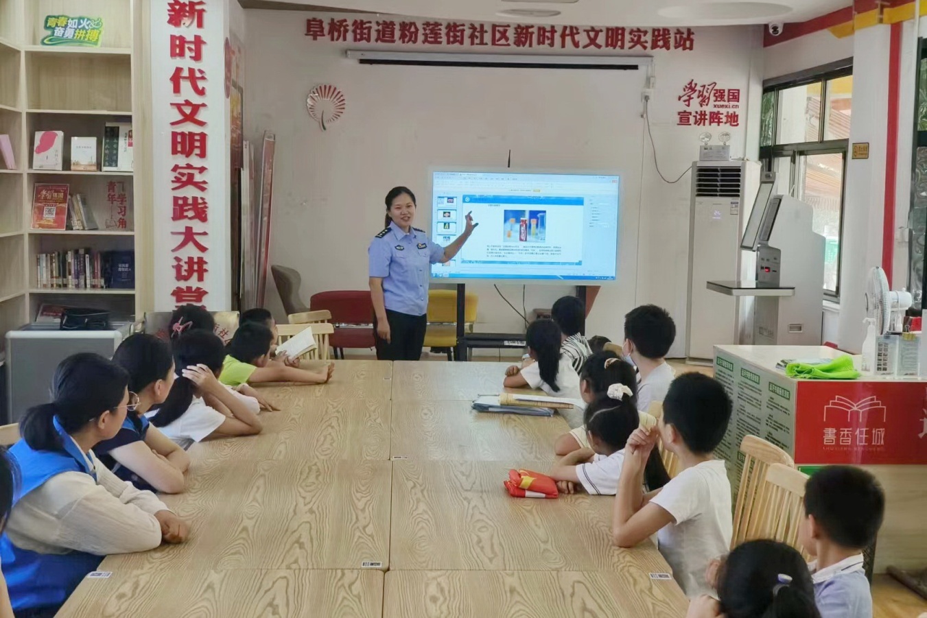 7月10日下午,阜桥派出所民警走进粉莲街社区运河书屋,为小朋友们举办了暑期防溺水、禁毒、防盗宣传讲座,采取播放视频、PPT课件及互动问答等多种方式,面对面讲解了防溺水相关知识,教育引导未成年人自觉远离水库、池塘河流等危险区域,严格做到“不准私自下水游泳、不准擅自结伴与他人游泳、不准在无家长或教师带领的情况下游泳、不准到无安全措施无救援人员的水域游泳、不准到不熟悉的水域游泳、不准熟悉水性的学生擅自下水施救”;同时,教授大家如何识别毒品及种类,切实认清毒品的严重危害,不进入治安复杂场所、不滥用药品,进一步提高了未成年人防溺水、禁毒意识,增强了未成年人识别险情、遇险逃生的能力,取得了良好社会效果。