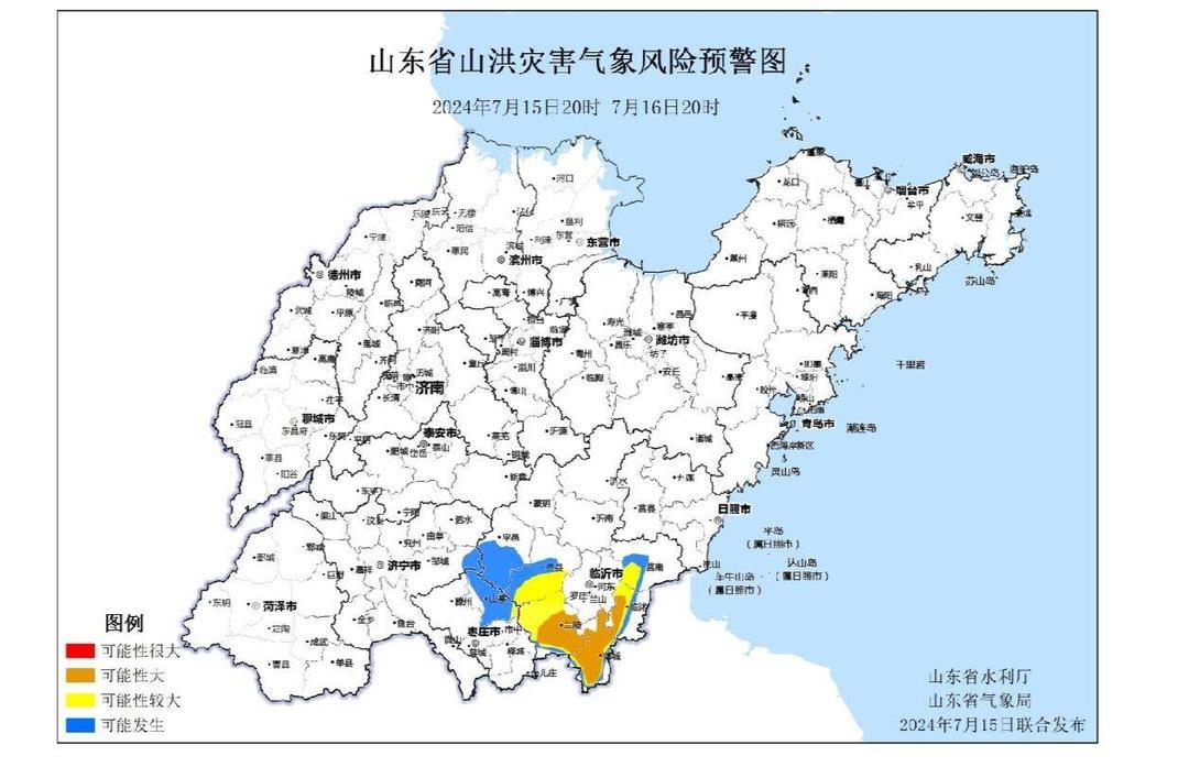山东省水利厅和山东省气象局7月15日联合发布山东省山洪灾害气象预警:预计15日20时至16日20时,临沂市局部地区发生山洪灾害的可能性大(橙色预警),枣庄、临沂市局部地区发生山洪灾害的可能性较大(黄色预警),济宁、枣庄、临沂等市局部地区可能发生山洪灾害(蓝色预警)。