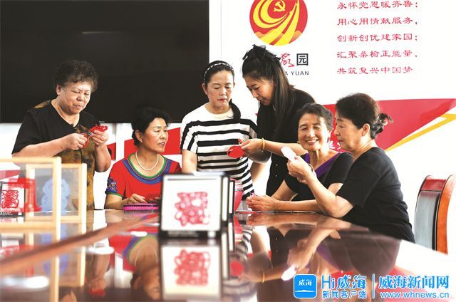 在环翠区西门外社区,老年大学老师正在教西门外社区居民剪纸。