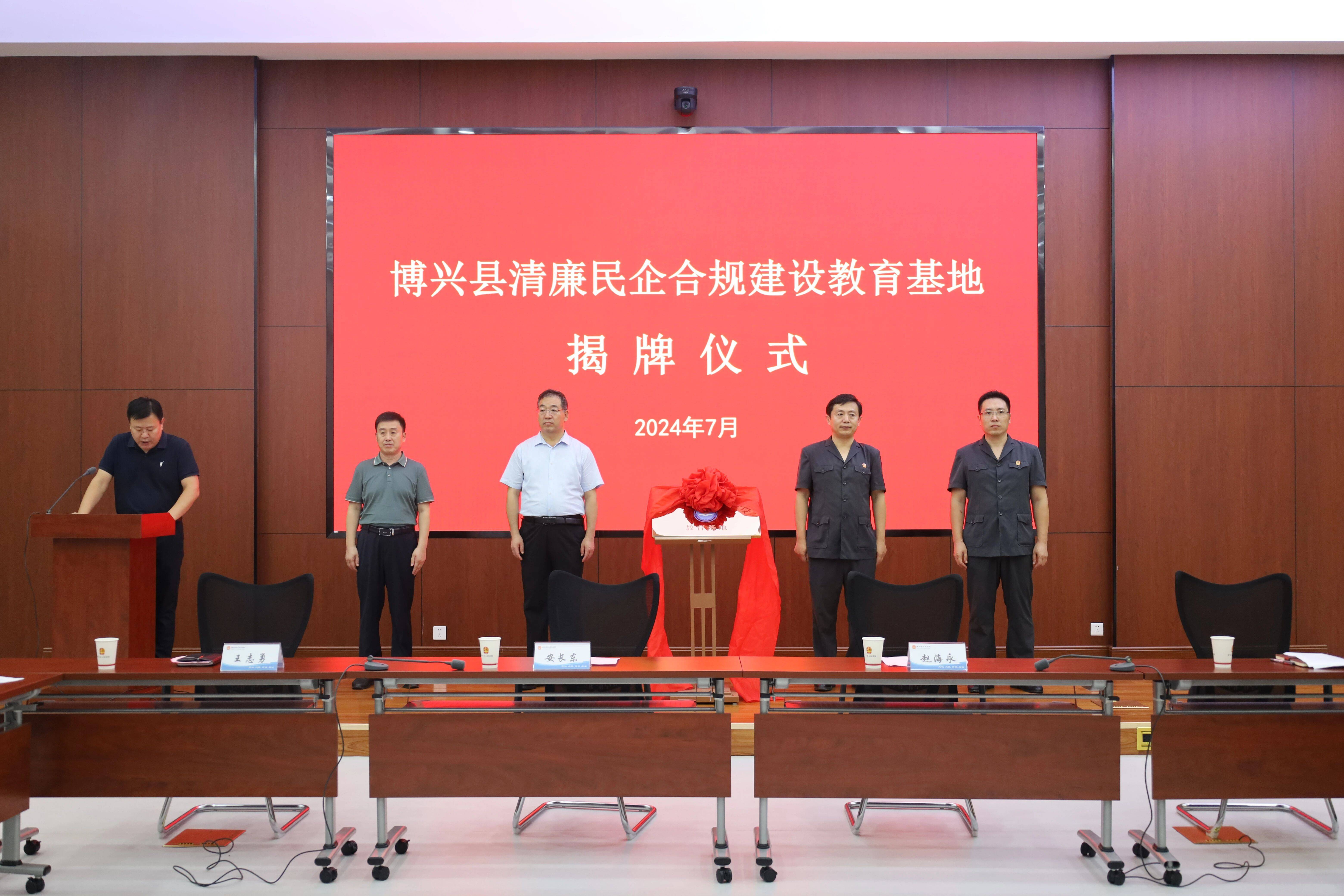 7月17日,博兴县清廉民企合规建设教育基地在博兴县人民法院揭牌成立,博兴县人大常委会副主任、县工商联主席安长东,博兴县人民法院党组书记、院长赵海永,博兴县委统战部副部长、县工商联党组书记黎冬冬,博兴县人民法院党组成员、审判委员会专职委员舒志喜及企业家代表参加揭牌仪式。博兴县委政法委副书记王志勇主持揭牌仪式。