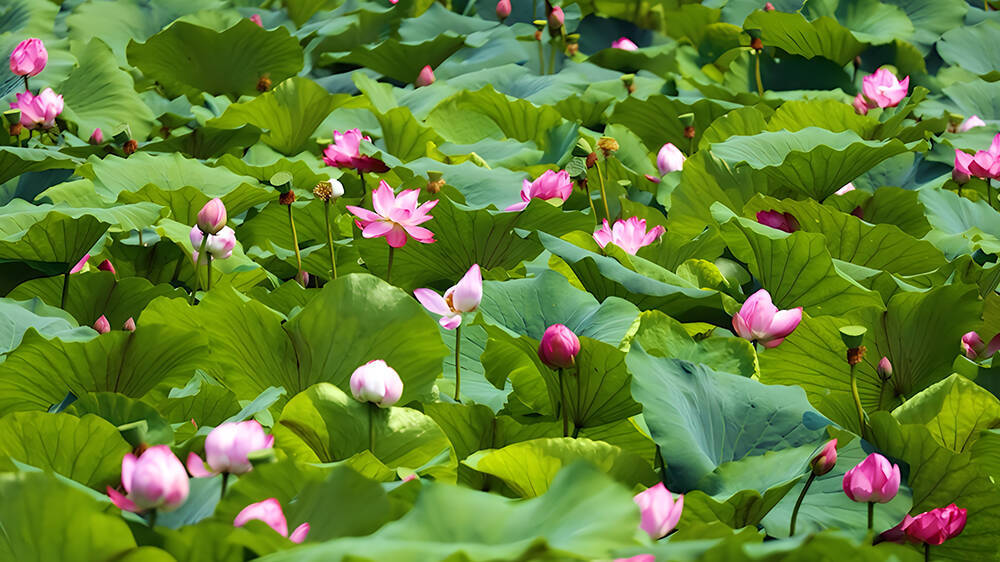 远远望去,池面上碧绿的荷叶繁茂如盖,荷花有的含苞待放“才露尖尖角”,有的含芳吐蕊完全盛开,舒展的花瓣粉中透白,晶莹剔透。
