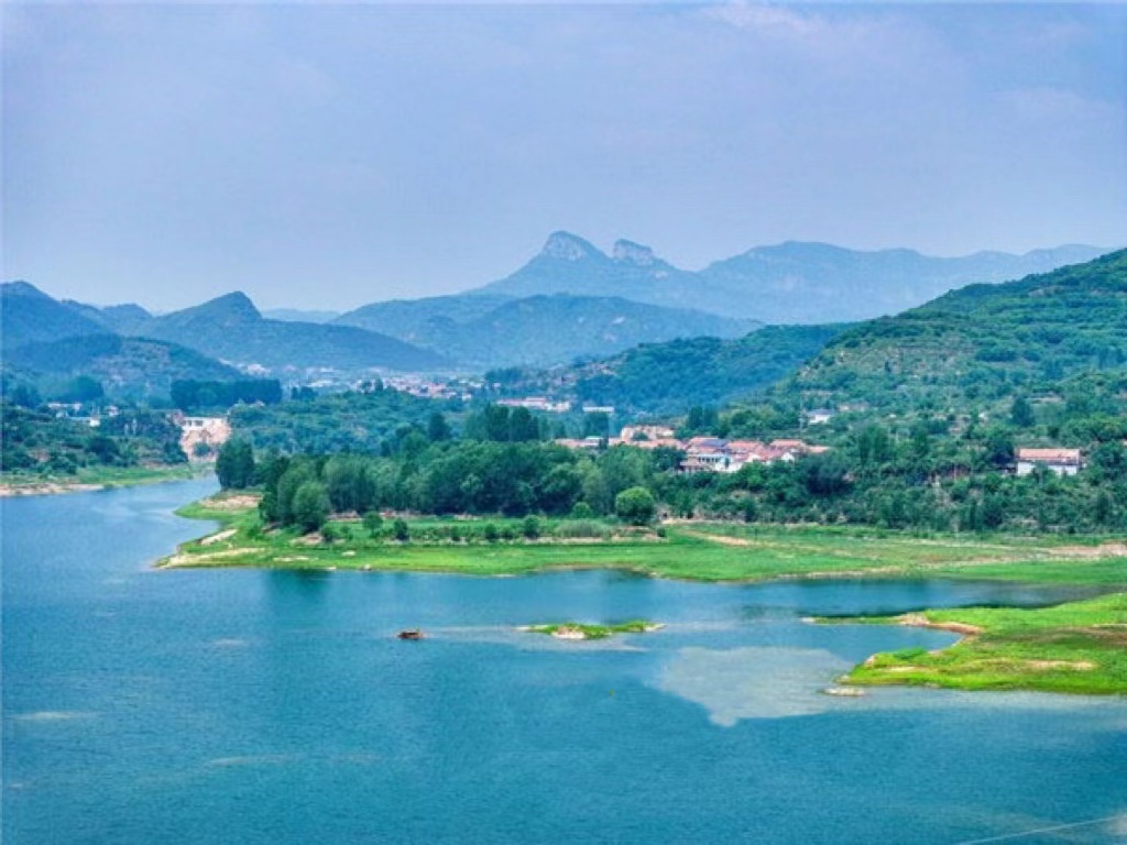 盛夏的济南章丘垛庄水库,山环水绕,碧水如镜。水库周围山峦起伏,林木葱郁,河水清澈,河岸上绿草茵茵,与周边村落形成了一幅美丽的生态画卷。(爱济南)