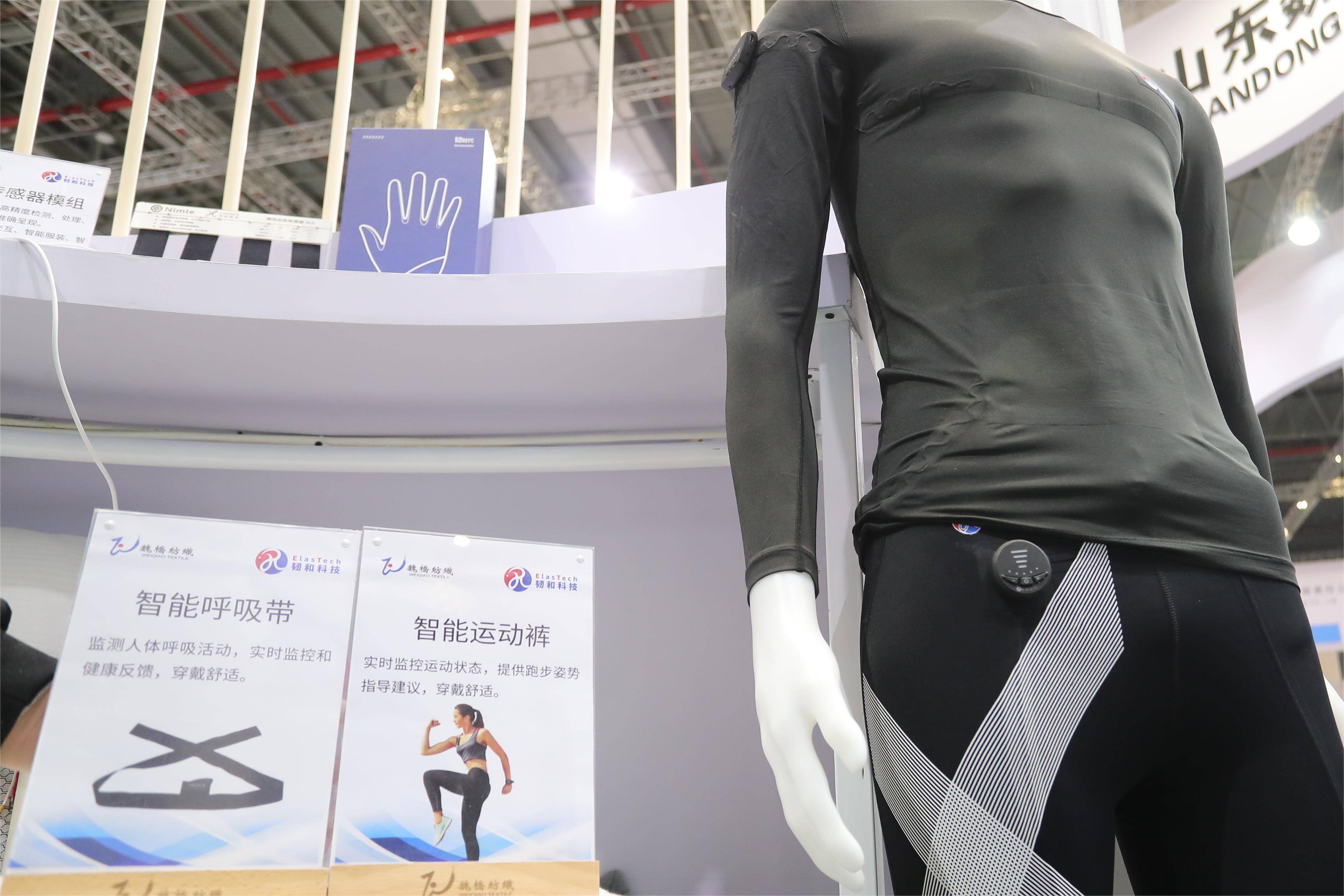 在工作人员的展示中,一款看上去普普通通的短袖上衣,通过与平板电脑的无线连接,可以在电脑屏幕上实时显示穿着者的呼吸、心跳等身体指标,实时监测穿着者的健康状况。这款衣服的面料中应用了高灵敏度的纳米材料,通过搭载的弹性应变传感器可以监测纳米材料的拉伸、压力等改变,一件衣服就变身为了可穿戴设备。另一款用中空纱线纺织成的面料,则有着超强的吸湿快干功能。研发人员通过包芯水溶性材料的应用,把纱线做成类似于“空心面”的中空结构,用这种纱线做成的衣物可以实现亲肤舒适、蓬松柔软的触感,给穿着者带来全新的体验。