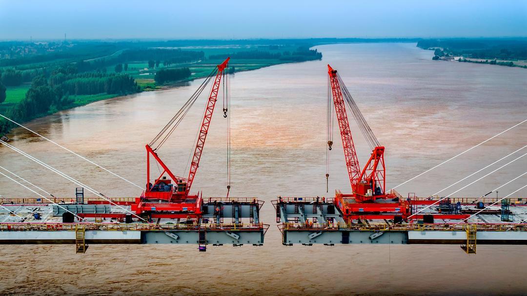 据项目负责人李伟介绍,东津黄河大桥主桥长880米,最大跨径420米。该桥为半漂浮结构体系,施工线型控制难、精度要求高,桥面为钢梁及混凝土桥面混叠合结构,采用悬拼吊机散件拼装,每12米一个节段,每个节段拼装14个构件,每个构件都会对线型产生影响,合龙时要求两边线型差小于2厘米,施工难度极大。