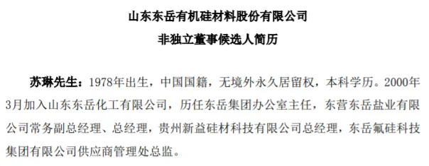 东岳硅材披露信息显示,苏琳生于1978年,2000年3月加入山东东岳化工有限公司,历任东岳集团办公室主任,东营东岳盐业有限公司常务副总经理、总经理,贵州新益硅材科技有限公司总经理,东岳氟硅科技集团有限公司供应商管理处总监。
