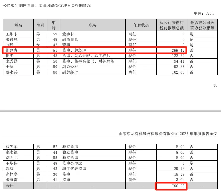2023年,郑建青在东岳硅材获得的年薪为299.42万元,不仅远超其他董监高的年薪,而且占该年度董监高薪酬总额的38.07%。