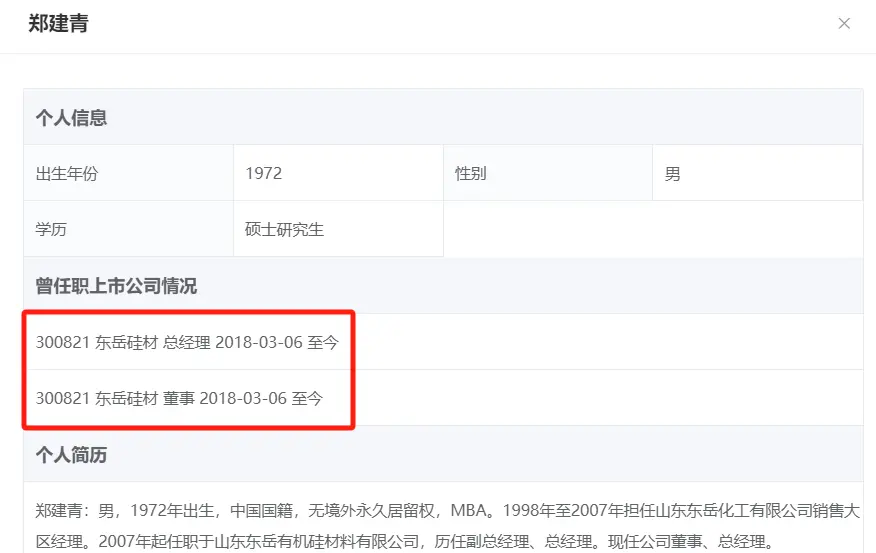 东岳硅材2023年年报显示,郑建青生于1972年,1998年至2007年担任山东东岳化工有限公司销售大区经理;自2007年起任职于山东东岳有机硅材料有限公司,历任副总经理、总经理;此次辞职前任公司董事、总经理。