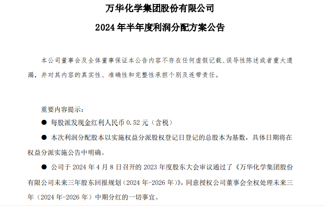 此外,分红回报作为衡量上市公司治理质量和价值创造能力的重要指标,万华化学也发布了2024年半年度利润分配方案公告。