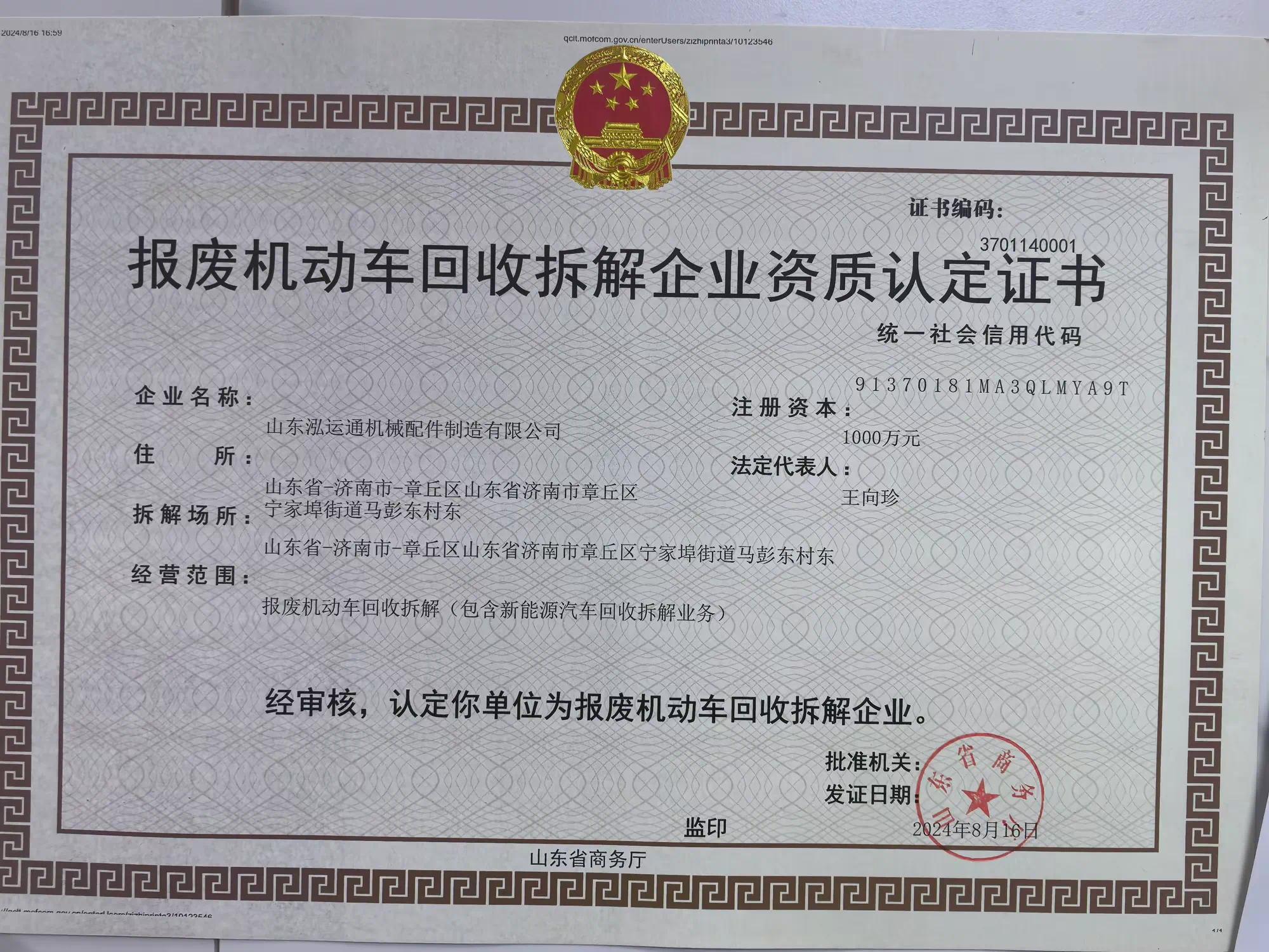 由于业务范围的不断扩大,2023年,公司已整体搬迁入驻宁家埠街道路通天成汽车循环经济产业园。8月13日,路通天成公司正式取得了“报废机动车回收拆解企业资质”,公司业务链条得到进一步完善。接下来,随着园区内山东路通机动车登记服务站的投入使用,公司的整个业务链条将在这里形成闭环,实现客户从购车、新车注册到二手车交易、二手车转移待出口,再到车辆报废拆解注销等一站式、全流程服务,客户无需多跑冤枉路,各类业务一次即可办好,省时又省力。