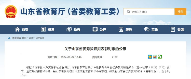 根据《山东省人力资源和社会保障厅 山东省教育厅关于评选表彰山东省优秀教师的通知》(鲁人社字〔2024〕67号)要求,通过逐级推荐和评选,经山东省优秀教师评选表彰工作领导小组审核,拟表彰山东省优秀教师540名(名单附后),现予以公示。