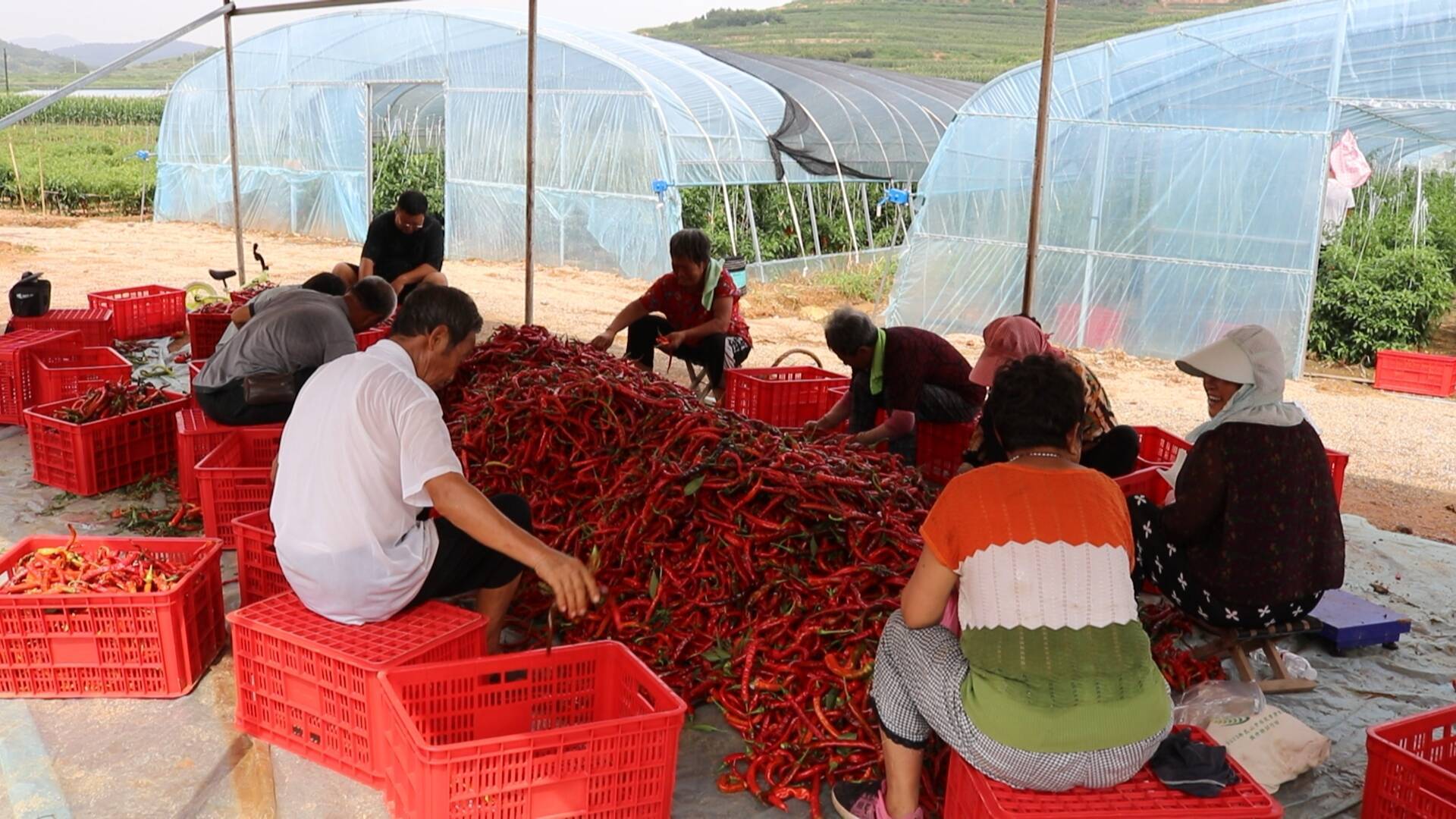 眼下正是大棚辣椒采摘旺季,走进乳山寨镇石硼崔家村党支部领办合作社的辣椒种植基地内,村民们穿梭在辣椒丛中,熟练地采摘、装袋、称重,一派繁忙景象。