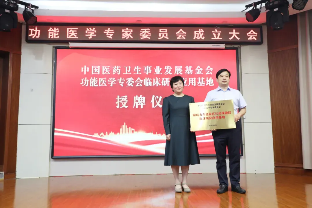 与会领导上台共同启动功能医学专家委员会成立仪式,并向东昌府区妇幼保健院进行中国医药卫生事业发展基金会功能医学专家委员会临床研究应用基地授牌。